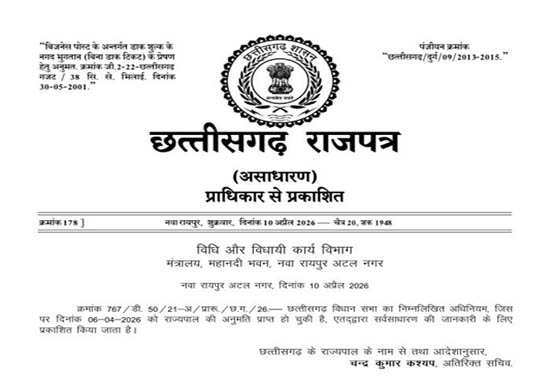 रायपुर, 18 अप्रैल। छत्तीसगढ़ में जबरन और प्रलोभन देकर कराए जाने वाले धर्मांतरण पर रोक लगाने के उद्देश्य से लाया गया छत्तीसगढ़ धर्म स्वातंत्र्य विधेयक, 2026 अब कानून बन गया है। राज्यपाल के हस्ताक्षर के बाद इसे राजपत्र में प्रकाशित कर दिया गया है, जिसके साथ ही यह पूरे प्रदेश में प्रभावी हो गया है।