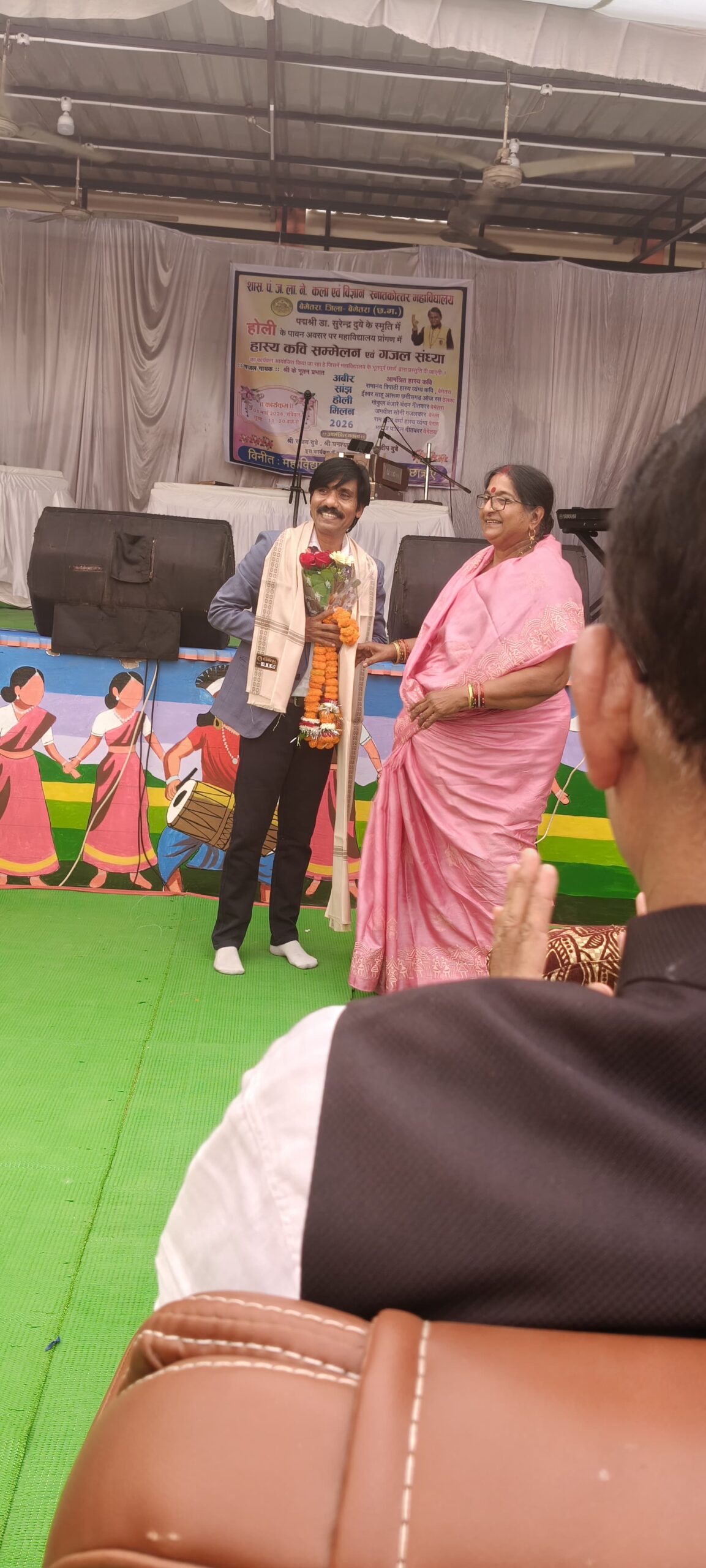 बेमेतरा =जिले के शासकीय पीजी कॉलेज बेमेतरा में होली के अवसर पर पद्मश्री डॉ सुरेंद्र दुबे की स्मृति में गजल संध्या और कवि सम्मेलन आयोजित किया गया। इस कार्यक्रम में मुख्य अतिथि के रूप में नगर पालिका के अध्यक्ष विजय सिन्हा उपस्थित हुए ।उन्होंने डॉ सुरेंद्र दुबे को याद करते हुए कहा कि बेमेतरा को विश्व स्तर में पहचान दिलाने में कवि डॉ सुरेंद्र दुबे का विशेष स्थान है। अतिथियों में संजय दुबे पारिवारिक सदस्य के रूप में शामिल हुए उन्होंने डॉ सुरेंद्र दुबे जी को याद करते हुए नमन किया साथ ही घनश्याम साहू डिप्टी सेक्रेटरी मंत्रालय रायपुर ने भी डॉ सुरेंद्र दुबे को याद करते हुए उनके कार्यों पर प्रकाश डाला। इस अवसर पर गजल गायक श्री के नूतन प्रभात द्वारा प्रस्तुत गजल ने सभी को मंत्रमुग्ध कर दिया। दोपहर के बाद कवि सम्मेलन में रामानंद त्रिपाठी बेमेतरा, गोकुल बंजारे बेमेतरा, ईश्वर साहू साजा, हृदय राम वर्मा बेरला, राजेश चौहान रायपुर, जगदीश सोनी बेरला, मनोज पाटिल गीतकार बेमेतरा,राजीव मधुकर नवागढ़, मनीष वर्मा नवागढ़, भोला राम साहू शायर बेमेतरा, उषा डहरे गीतकार बेमेतरा, घनश्याम साहू, डॉ डॉशन साहू साजा, जितेंद्र बारले ने अपने कविताओं और गीतों के माध्यम से सभी को भाव विभोर कर दिया। इस कार्यक्रम मे महाविद्यालय के प्राचार्य डॉ वीणा त्रिपाठी के साथ श्री डी आर साहू, एम एफ खान, डॉ डी द्विवेदी, श्रीमती ज्योति गेंदले, डॉ आर के त्रिपाठी, श्रीमती नर्मदा, सुश्री सृष्टि तिवारी, श्री राजकुमार वर्मा डी एम सी, श्री राजेश शर्मा, और छात्र छात्राएं उपस्थित रहे। कार्यक्रम का संचालन प्रोफेसर जितेंद्र बारले ने किया। कार्यक्रम का उद्देश्य युवाओं में साहित्य और संगीत के प्रति रुचि पैदा करना था।