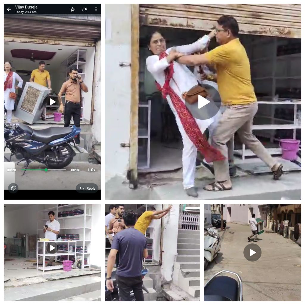 दुकान मालिक महिला का सामान बाहर फेकते आरोपी