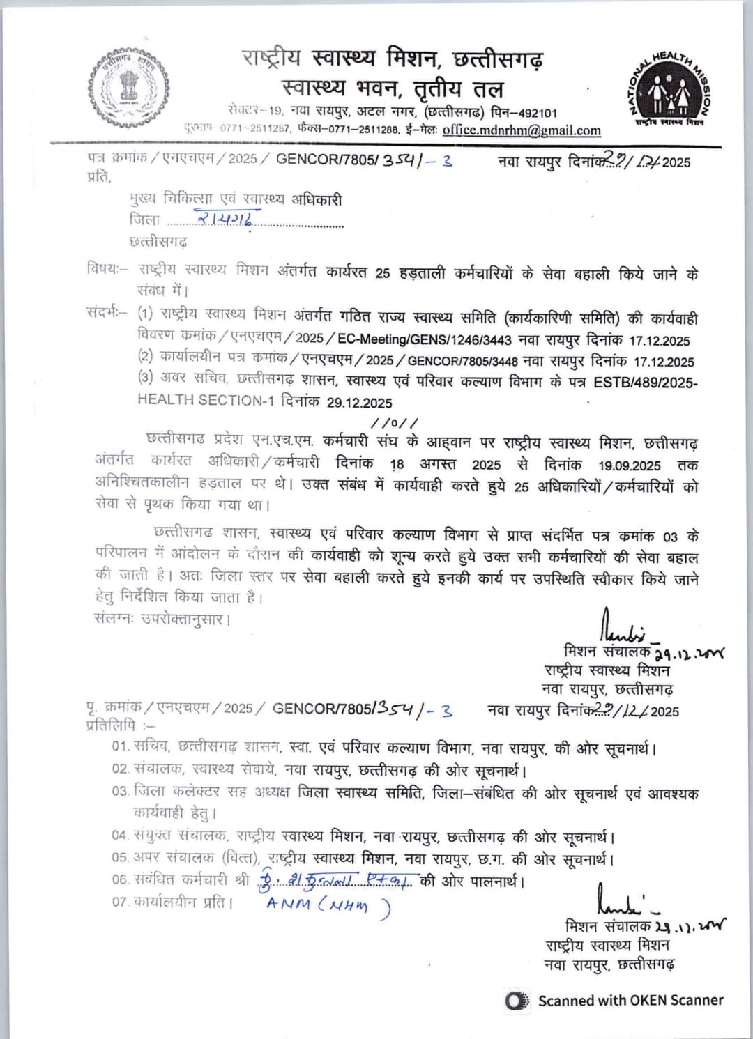 रायगढ़ : नये साल की पूर्व संध्या पर छत्तीसगढ़ के राष्ट्रीय स्वास्थ्य मिशन (NHM) के संविदा कर्मचारियों को बड़ी राहत मिली है। राज्य सरकार ने स्वास्थ्य एवं परिवार कल्याण विभाग के निर्देश पर मिशन संचालक, राष्ट्रीय स्वास्थ्य मिशन, छत्तीसगढ़ द्वारा जारी आदेश में हड़ताल अवधि (18 अगस्त 2025 से 19 सितंबर 2025) के दौरान की गई प्रशासनिक कार्रवाई को शून्य करते हुए 25 बर्खास्त संविदा अधिकारियों एवं कर्मचारियों की सेवा बहाली का निर्णय लिया है। इस आदेश के अनुसार, संबंधित कर्मचारियों की जिला स्तर पर सेवा बहाली की जाएगी तथा उनकी कार्य पर उपस्थिति स्वीकार की जाएगी। इसके लिए सभी जिलों के कलेक्टर, मुख्य चिकित्सा एवं स्वास्थ्य अधिकारी तथा जिला स्वास्थ्य समितियों को आवश्यक निर्देश जारी कर दिए गए हैं।