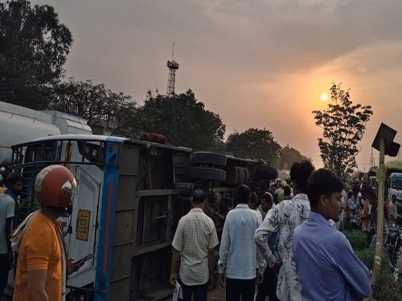 रायपुर में बड़ा सड़क हादसा : डिवाइडर पर चढ़कर पलटी यात्री बस, 12 लोग घायल