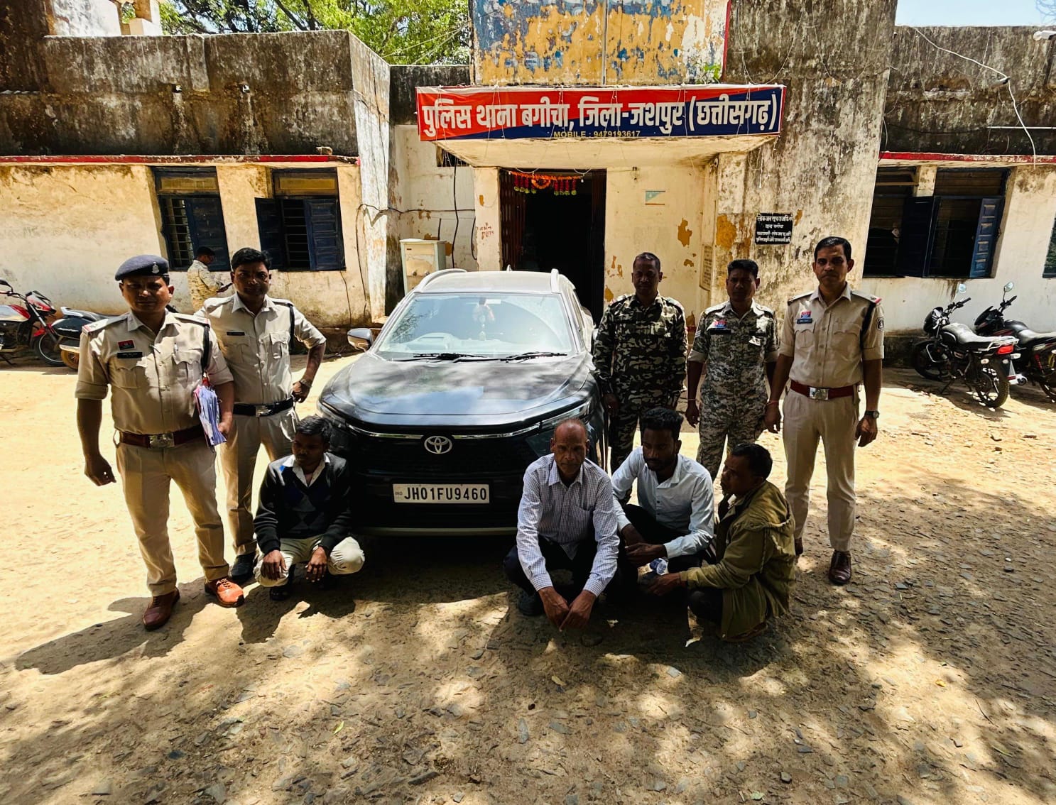 पुलिस की पूछताछ पर अपराध स्वीकार करने व प्रयाप्त सबूत पाए जाने पर मामले से जुड़े पांच आरोपियों क्रमशः – मीनी बाई , कालेश्वर राम , अनिल लकड़ा, शिवनाथ राम उम्र, नीरा सिंह उम्र 36 वर्ष को विधिवत गिरफ्तार कर न्यायिक रिमांड पर जेल भेजा गया है। व मुख्य संदिग्ध आरोपी शिवशंकर राम उम्र 29 वर्ष निवासी ग्राम घाघरा, थाना सन्ना जिला जशपुर (छ. ग) का पुलिस रिमांड लिया गया है। जिससे पुलिस पूछताछ कर रही है, मामले में पुलिस की जांच जारी है व पीड़ितों तथा ठगी की रकम बढ़ सकती है, प्रकरण से जुड़े अन्य आरोपियों के विरुद्ध भी पुलिस कठोर वैधानिक कार्यवाही करेगी। पुलिस ने आरोपी शिवशंकर राम के कब्जे से टोयोटा टायजर कार क्रमांक jH – 01FU -9460 को भी जप्त किया है।