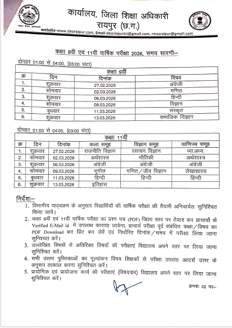 रायपुर। Chhattisgarh के सरकारी स्कूलों में पढ़ने वाले छात्रों के लिए अहम खबर सामने आई है। 9वीं और 11वीं कक्षा की वार्षिक परीक्षाओं का टाइम टेबल अचानक जारी कर दिया गया है। जिला शिक्षा अधिकारी द्वारा 23 फरवरी को परीक्षा कार्यक्रम जारी किया गया।