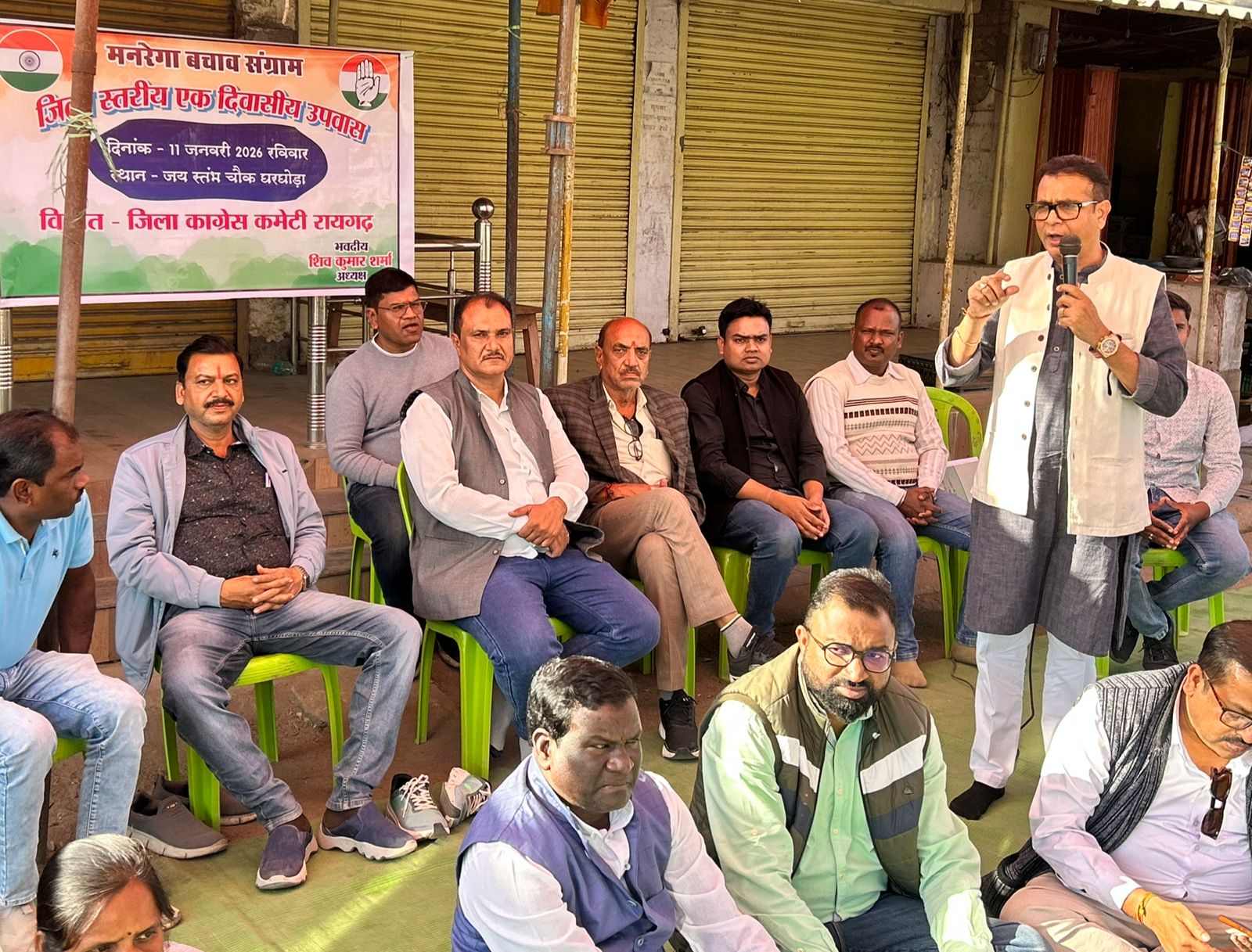 भारतीय राष्ट्रीय कांग्रेस द्वारा देशभर में चलाए जा रहे “मनरेगा बचाव संग्राम” (राष्ट्रीय कार्यक्रम) के अंतर्गत जिला कांग्रेस कमेटी रायगढ़ ग्रामीण के नेतृत्व में आज जय स्तंभ चौक, घरघोड़ा में जिला स्तरीय एक दिवसीय उपवास एवं प्रतीकात्मक विरोध कार्यक्रम का आयोजन किया गया। यह कार्यक्रम केंद्र की भाजपा सरकार द्वारा मनरेगा को कमजोर करने और गरीबों से काम करने का संवैधानिक अधिकार छीनने की साजिश के खिलाफ आयोजित किया गया।