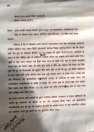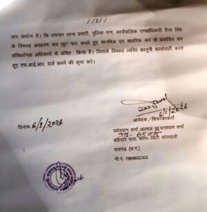 रायगढ़। स्थानीय पुरानी बस्ती बहिदार पारा निवासी दीपक शर्मा को 12 दिसंबर को पुलिस द्वारा जेल भेजे जाने के मामले ने तूल पकड़ लिया है। दीपक शर्मा के पिता एवं सामाजिक कार्यकर्ता राधेश्याम शर्मा ने तमनार थाना प्रभारी कमला पुसाम तथा तहसीलदार/कार्यपालिक दण्डाधिकारी ऋचा सिंह के विरुद्ध गंभीर आरोप लगाते हुए सिटी कोतवाली में लिखित शिकायत दर्ज कराई है। उन्होंने दोनों अधिकारियों के खिलाफ अपहरण, लूटपाट, मानसिक व शारीरिक प्रताड़ना तथा संवैधानिक अधिकारों के उल्लंघन का आरोप लगाते हुए एफआईआर दर्ज करने की मांग की है।