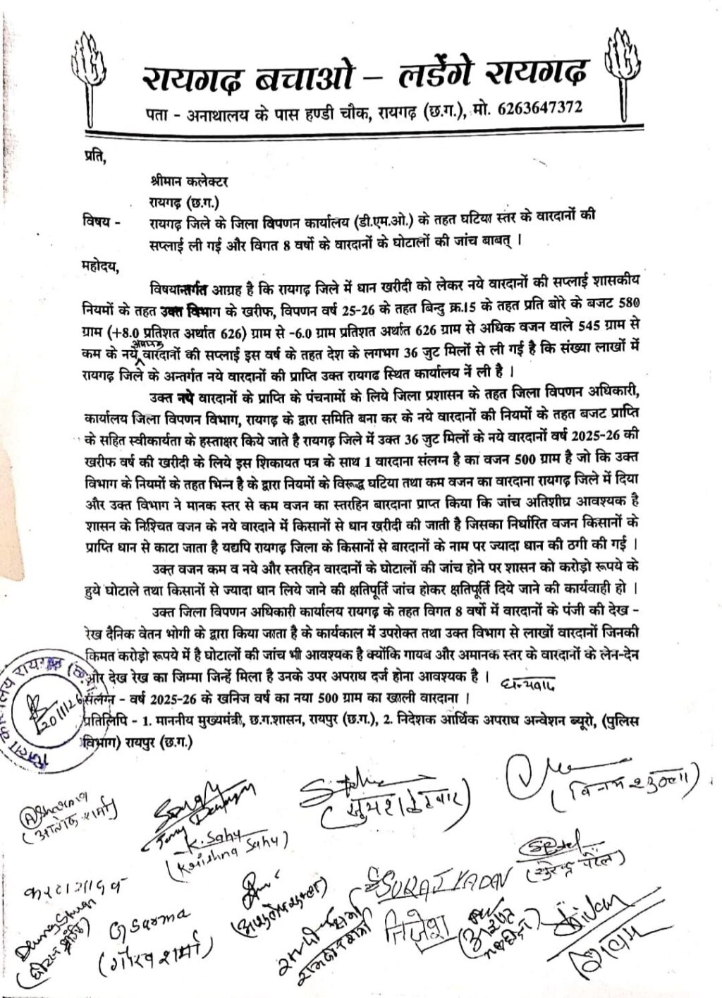 जब खरीदी केंद्रों में किसानों की बात नहीं सुनी गई तो किसानों के प्रतिनिधि मंडल के मय सबूत और शिकायत ज्ञापन के साथ रायगढ़ के कलेक्टर मयंक चतुर्वेदी महोदय से भेंट किया गया और उन्हें ज्ञापन के साथ 500 ग्राम का घटिया और अमानक स्तर का नया बोरा प्रस्तुत किया।इस ज्ञापन में आग्रह किया कि रायगढ़ जिला विपिन विभाग के द्वारा देश की लगभग 36 जुट मिलो से लगभग 2 करोड़ 52 लाख के लगभग नया बारदाना रायगढ़ जिले के वर्ष 2025 – 26 के धान खरीदी के लिए नया बोरा की सप्लाई ली गईं जो कि प्रदेश के विपणन विभाग के नियमों के तहत वर्ष 2025-26 के तहत बिंदु 15 के अंतर्गत 580 ग्राम(+8.0% अर्थात 626ग्राम से – 6.0% अर्थात 626 ग्राम से अधिक वजन वाले तथा 545 ग्राम से कम होने पर अमानक स्तर के माने जाते हैं कि सप्लाई प्राप्त कर करोड़ों रुपए के भ्रष्टाचार को अंजाम दिया है।