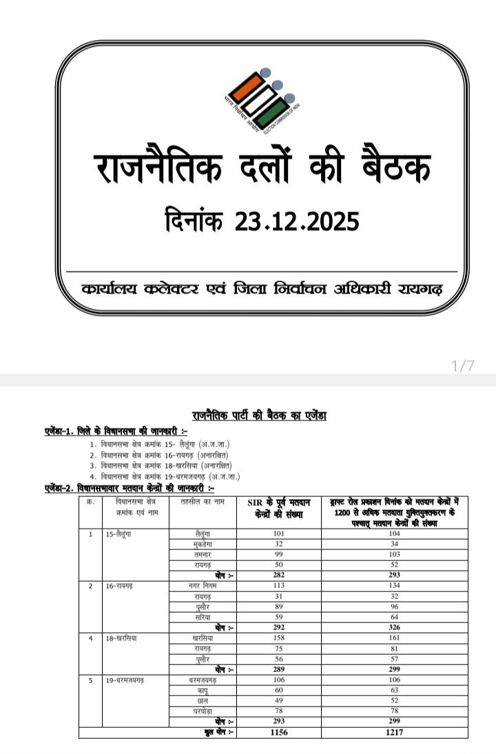 रायगढ़ में 19,341 मतदाताओं को नोटिस, पुनरीक्षण के लिए दस्तावेज जमा करने का दिया समय