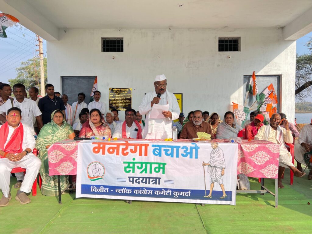 राजनांदगांव : छत्तीसगढ़ प्रदेश कांग्रेस कमेटी के अध्यक्ष दीपक बैज जी के आह्वान पर और जिला अध्यक्ष विपिन यादव के निर्देश पर, कुमर्दा ब्लॉक कांग्रेस कमेटी ने “मनरेगा बचाओ संग्राम” कार्यक्रम के तहत जन-जागरूकता पदयात्रा आयोजित की। पदयात्रा ग्राम उमरवाही में महात्मा गांधी जी की मूर्ति पर माल्यार्पण के साथ प्रारंभ हुई और लगभग 6 किलोमीटर तय कर ग्राम गिदर्री में आमसभा के साथ समाप्त हुई। इस यात्रा में 82 वर्षीय नम्मू जी सहित कई वरिष्ठ ग्रामीणजन भी शामिल हुए, जिनका जिला अध्यक्ष विपिन यादव ने स्वागत एवं सम्मान किया।