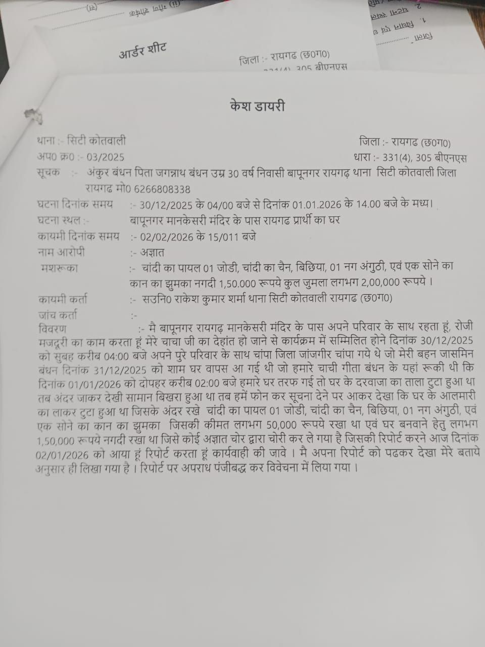 पीड़ित अंकुर बंधन ने पुलिस को बताया कि उनके किसी निकट रिश्तेदार का आकस्मिक निधन होने के कारण वह 30 दिसंबर 2025 को अपने परिवार सहित जांजगीर-चांपा गए थे। परिवार 31 दिसंबर 2025 को लौट आया, लेकिन घर पहुंचने पर पता चला कि मकान में चोरी हुई है। इसके बाद परिवार ने 1 जनवरी 2026 को सिटी कोतवाली रायगढ़ में रिपोर्ट दर्ज कराई