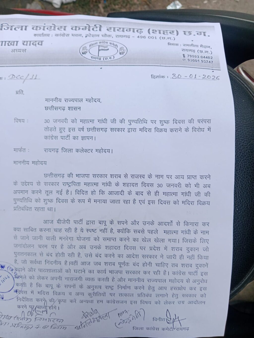 ज्ञापन में कांग्रेस ने कहा कि आजादी के बाद से 30 जनवरी को शुष्क दिवस के रूप में मनाया जाता रहा है और इस दिन शराब दुकानों को बंद रखा जाता रहा है। लेकिन इस वर्ष शराब बिक्री की अनुमति देने से पार्टी ने इसे निंदनीय बताया और इसे बापू के आदर्शों के खिलाफ करार दिया।