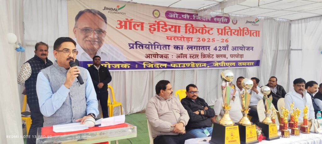 वहीं अपने मुख्ए आतिथ्य सम्बोधन में ’ओ.पी.जिंदल स्मृति आॅल इंडिया क्रिकेट प्रतियोगिता घरघोड़ा को श्रेष्ठ प्रतियोगिता प्रतिपादित करते हए इसे क्षेत्र के युवा खिलाड़ियों के अपने प्रतिभा प्रदर्षन का बेहतर मंच बताया। श्री जैन ने घरघोड़ा खेल प्रांगड़ विकासयात्रा पर परिचर्चा करते अद्धभुत बताया। उन्होनें खेलों के विकास के लिए सीएसआर जेपीएल के प्रयासों की प्रशंसा की।